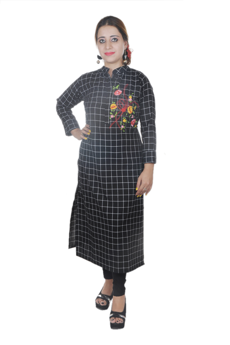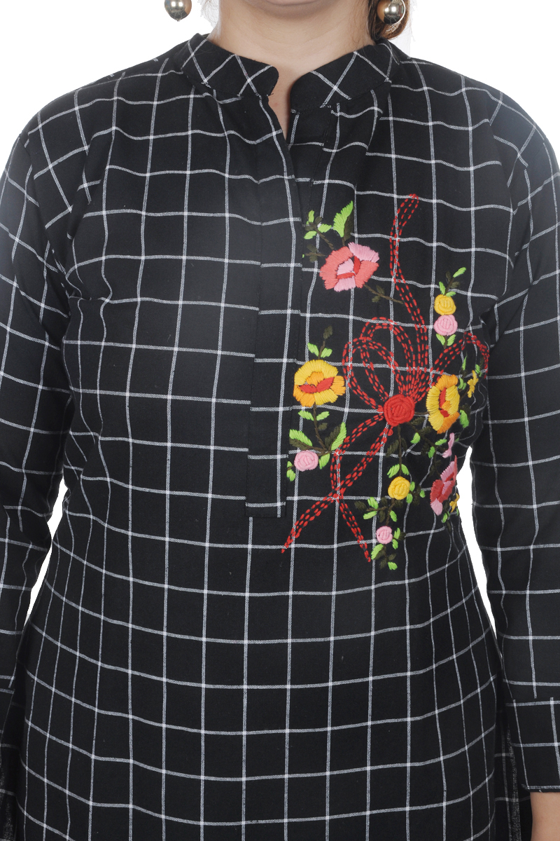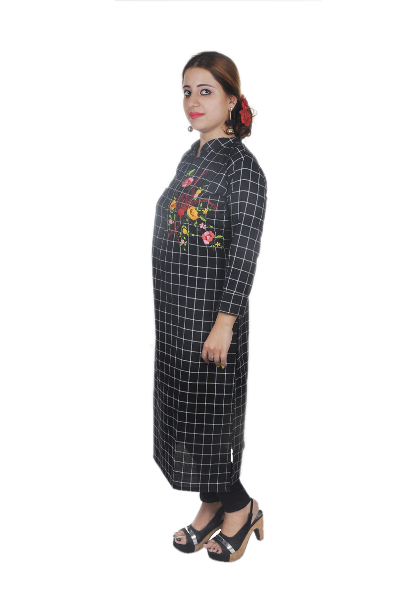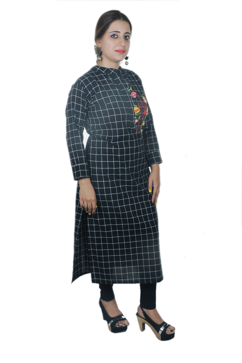 Linen cloth checks self weaving kurta ..with colorful flowering handwork