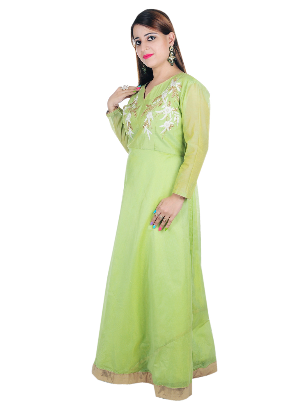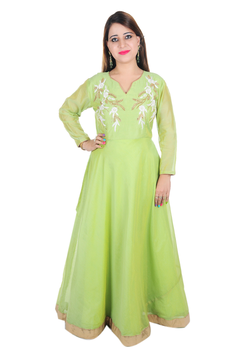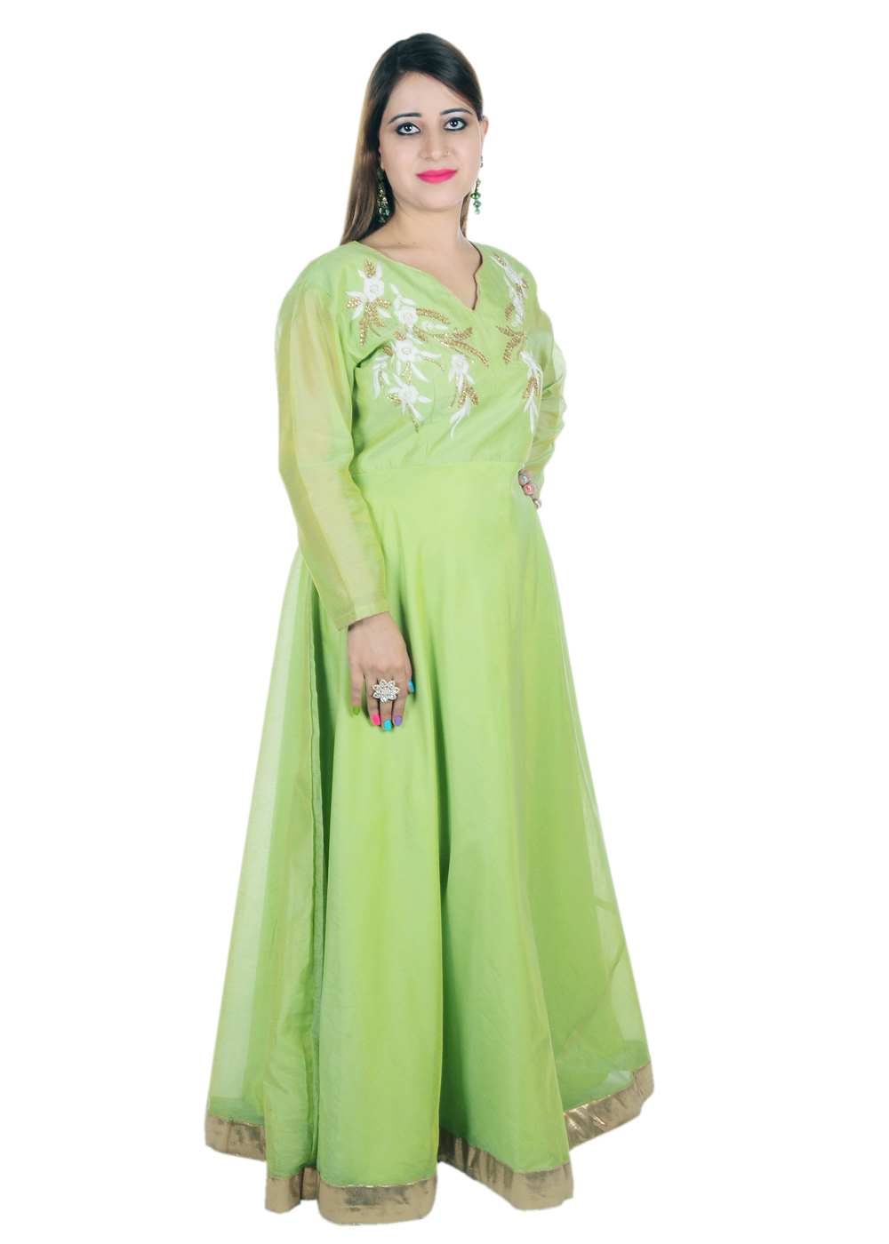 Parrot Green pyor chanderi gown resham &stone work in yoke