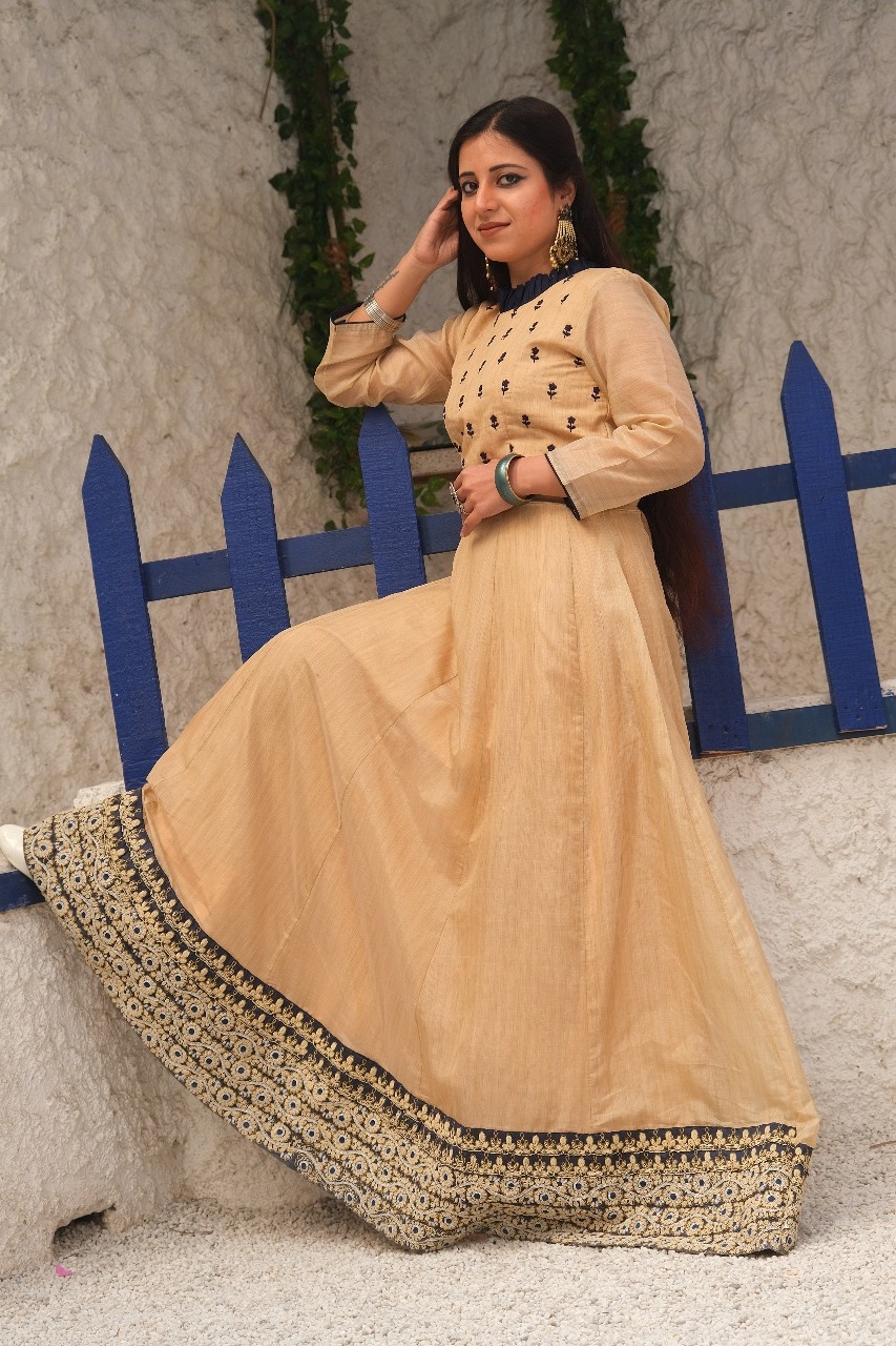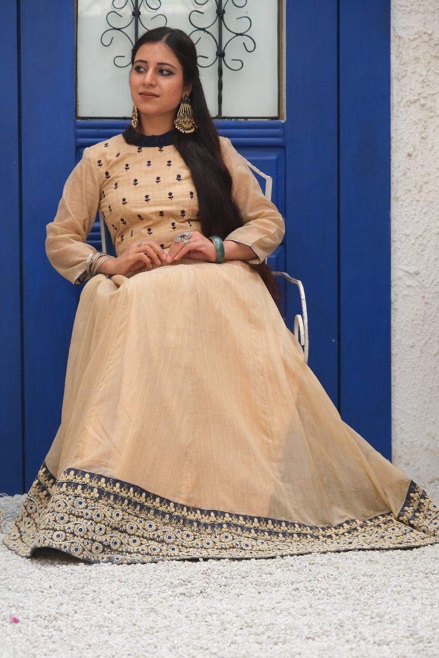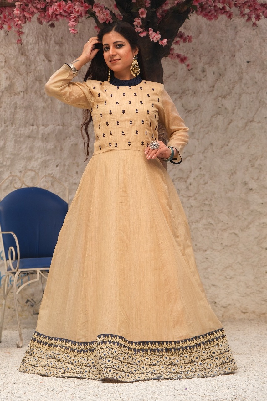 Beige color beautiful gown with nevy blue thread work butis n border.