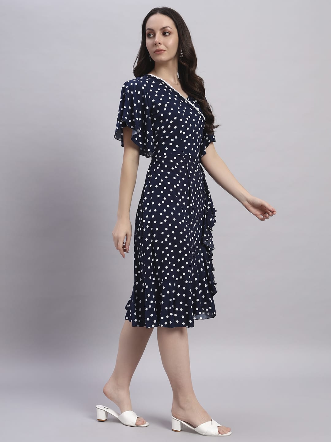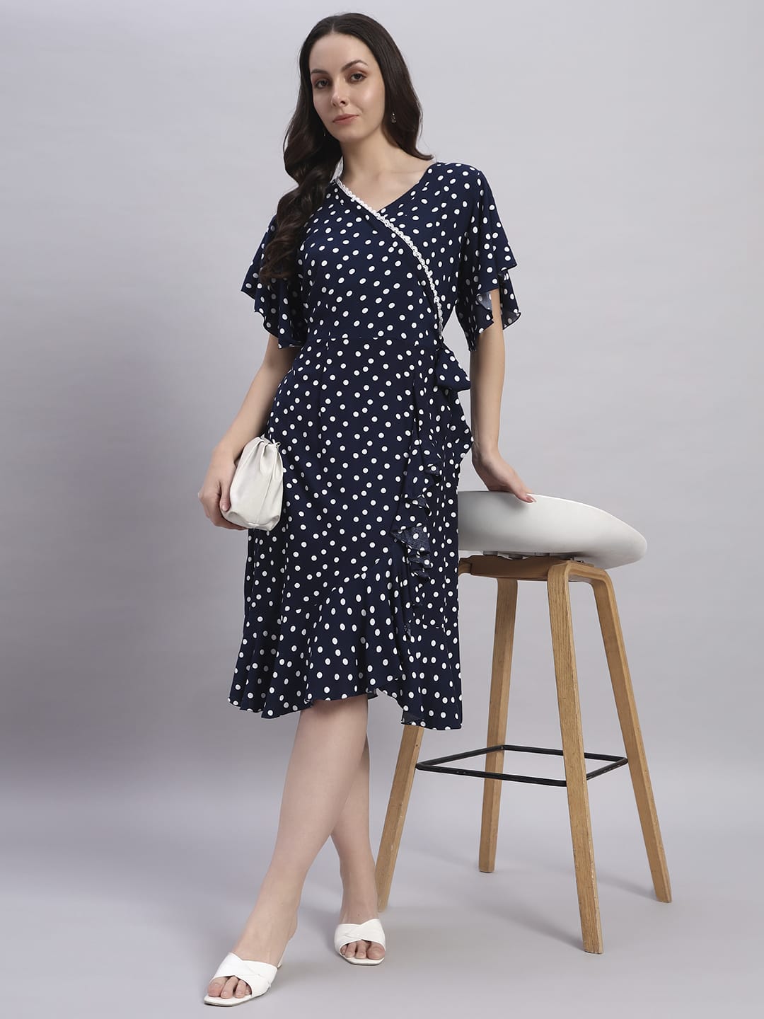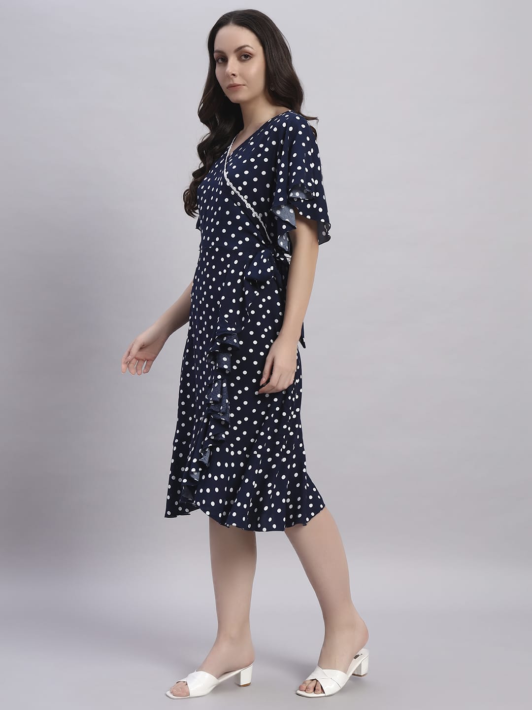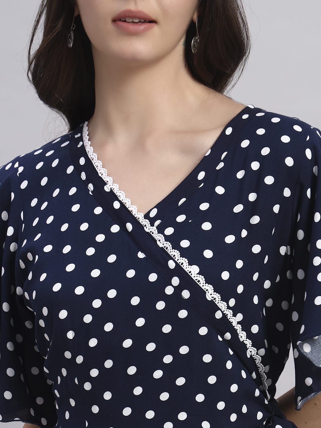 Step out in timeless style with our Lacy Trim Polka Midi Dress. This beautiful navy blue wrap dress features an all-over classic white polka dot print. The flattering V-neckline is beautifully accented with delicate white lace trim, adding a touch of feminine charm. Designed with elegant flared sleeves and a cascading ruffle detail along the wrap skirt, this dress offers an effortlessly chic look and a comfortable, adjustable fit. Perfect for brunches, day parties, or stylish casual outings.